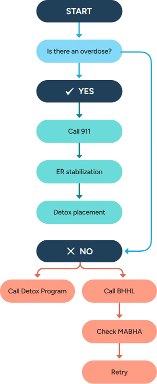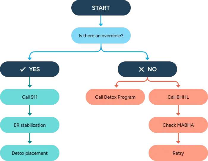 Tell responders about any substances used so they can choose the right medical care. In Massachusetts, the Good Samaritan Law protects you from arrest for personal-use possession when you call for help. Emergency departments can medically stabilize the person and often coordinate direct transfers to an Acute Treatment Services (ATS) detox program once the patient is safe.