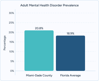 Adult mental health prevalence: About 20.8% of adults in Miami-Dade County report experiencing a mental health disorder in a given year, compared with the Florida average of 18.9%.