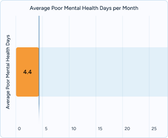 Poor mental health days: Residents report an average of 4.4 “poor mental health days” per month, reflecting ongoing stress and unmet needs.