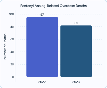 Substance use: Deaths involving fentanyl analogs fell from 97 in 2022 to 81 in 2023, a 16% decline, though fentanyl itself remains the leading driver of overdose deaths.