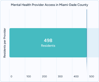 Provider access: Miami-Dade has roughly 498 residents for every one mental health provider, limiting access in high-need neighborhoods.