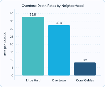 Neighborhood disparities: Little Haiti (35.8 per 100,000) and Overtown (32.4 per 100,000) report some of the highest overdose rates, while Coral Gables (8.2 per 100,000) remains among the lowest.